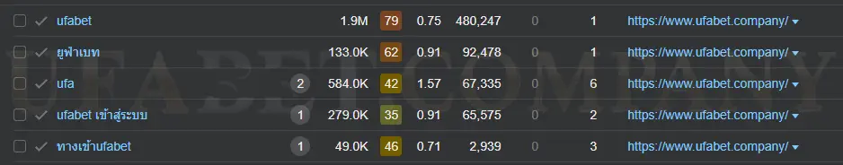 การสอบถามของเราจะตรวจสอบตัวบ่งชี้ที่สำคัญของสถานะออนไลน์ เช่น ปริมาณการค้นหาและความยากของคำหลัก โดยติดตามวิวัฒนาการไปจนถึงต้นปี 2024 จากข้อมูลอัปเดตล่าสุดจากฐานข้อมูลที่ครอบคลุมของ Ahrefs ในเดือนกันยายน 2023 การสืบสวนของเราเผยให้เห็นการเปลี่ยนแปลงที่ละเอียดอ่อนแต่มีนัยสำคัญที่ UFA BET มีการก้าวหน้าอย่างมีกลยุทธ์ในวงการ iGaming ของประเทศไทย