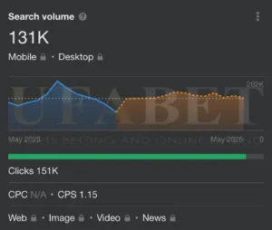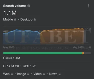 ตามข้อมูลการประเมินค่าคำหลักจาก Ahrefs.com ปริมาณการค้นหาปัจจุบันสำหรับ ‘UFABET‘ คือ 1.1 ล้านต่อเดือน แนวโน้มปริมาณการค้นหาแสดงให้เห็นถึงการเติบโตอย่างต่อเนื่อง โดยคาดว่าจะมีการค้นหาถึง 1.4 ล้านครั้งภายในเดือนพฤษภาคม 2568 โดยแต่ละ CPC หรือราคาต่อหนึ่งคลิกมีมูลค่าประมาณ 1.20 ดอลลาร์ในปัจจุบัน ทำให้มูลค่าคีย์เวิร์ดของแบรนด์อยู่ที่ 1,680,000.00 ดอลลาร์ต่อเดือน
