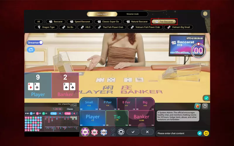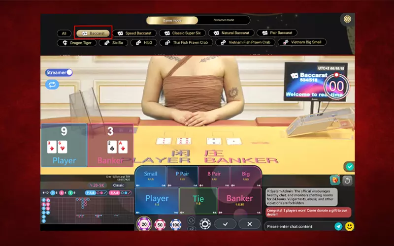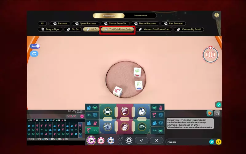 UFA ทั้งหมด ได้ทำลายสถิติใหม่ด้วยการนำเสนอโหมดเกมที่แตกต่างกันสองโหมดซึ่งตอบสนองสไตล์การพนัน ที่แตกต่างกัน เกมแรกเรียกว่า โหมดเกม เป็นเกมดีลเลอร์สดแบบดั้งเดิมที่มอบประสบการณ์ คาสิโน ที่แท้จริงโดยตรงไปยังหน้าจอของคุณ โหมดนี้มีเกม คาสิโน ที่หลากหลาย 11 เกม รวมถึง Baccarat, Sic Bo, Dragon Tiger, Gourd, Crab, Fish และอื่นๆ