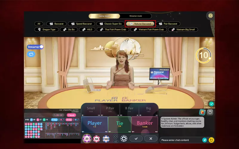แพลตฟอร์มนี้แนะนำ 1 โต๊ะสำหรับ Natural Baccarat ซึ่งเป็นรูปแบบที่น่าสนใจของเกมคลาสสิค กฎเกณฑ์เป็นไปตามรูปแบบดั้งเดิม มีสไตล์การเล่นที่เป็นธรรมชาติสำหรับทั้งเจ้ามือและผู้เล่น มีส่วนร่วมในการพลิกผันอันน่าหลงใหลและสัมผัสประสบการณ์ด้วยไพ่บาคาร่าในเกมรูปแบบใหม่