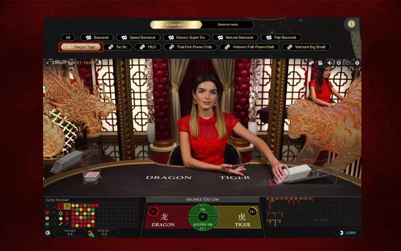 เตรียมพบกับความตื่นเต้นเร้าใจในอาณาจักรพยัคฆ์มังกร เกมที่น่าตื่นเต้นนี้ใช้ไพ่แปดสำรับ สำหรับไพ่ทั้งหมด 416 ใบ เจ้ามือจะเปิดไพ่สองใบ: ใบหนึ่งสำหรับมังกรและอีกใบสำหรับเสือ ชัยชนะถูกกำหนดโดยคะแนนเท่านั้น คะแนนรวมที่สูงขึ้นจะรับประกันชัยชนะ เตรียมพร้อมสำหรับการต่อสู้ที่น่าตื่นเต้นและรวดเร็วใน Dragon Tiger มีให้เลือกเพียง 1 โต๊ะเท่านั้น