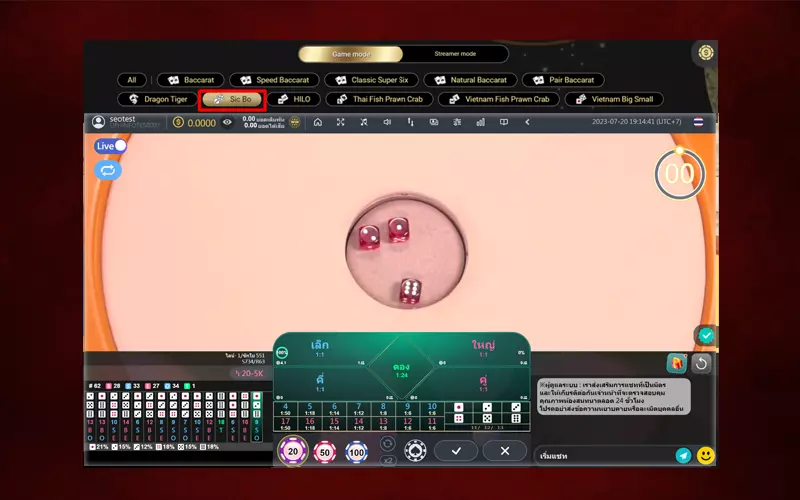 เข้าสู่อาณาจักรของ Sic Bo เกมลูกเต๋าที่จะทำให้คุณติดขอบโต๊ะ เล่นกับลูกเต๋าสามลูก จุดประสงค์คือทำนายผลรวมของหน้าลูกเต๋าหลังจากเขย่า ด้วยตัวเลือกการเดิมพันมากมาย ผู้เล่นสามารถสำรวจกลยุทธ์ต่างๆ และสนุกไปกับการทอยลูกเต๋า วางเดิมพันของคุณและปล่อยให้ลูกเต๋าตัดสินชะตากรรมของคุณ มีโต๊ะว่างเพียง 1 โต๊ะเท่านั้น