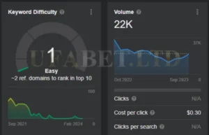 แนวโน้มที่น่าสังเกตในตลาดประเทศไทยคือการเกิดขึ้นของคำหลักที่เกี่ยวข้องกับเว็บไซต์เกมเหล่านี้ ซึ่งเริ่มต้นปี 2566 ด้วยปริมาณการค้นหา 18,434 แม้ว่าตัวเลขนี้อาจดูไม่มีนัยสำคัญในตอนแรก แต่เส้นทางการเติบโตของการค้นหาคำหลักนี้ก็น่าทึ่ง โดยแสดงการเพิ่มขึ้นมากกว่า 130% ในขณะที่ยังคงรักษาระดับความยากของคำหลัก (KD) ที่ต่ำมาก การตรวจสอบกราฟแนวโน้มด้วยสายตาสำหรับคีย์เวิร์ด “22FUN” เผยให้เห็นการเคลื่อนไหวขาขึ้นอย่างต่อเนื่อง ปัจจุบันมีปริมาณการค้นหาปานกลางที่ 23,000 แต่ KD ยังคงอยู่ในระดับต่ำอย่างน่าประหลาดใจที่ 0 ซึ่งบ่งชี้ว่าคำหลัก “22FUN” อาจดึงดูดความสนใจของบุคคลที่ต้องการเข้าสู่ธุรกิจเว็บไซต์ เมื่อพิจารณาจากการเติบโต ความนิยมและการแข่งขันต่ำ