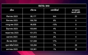 ความนิยมในการค้นหาของคีย์เวิร์ด “BK8” มีแนวโน้มที่น่าสนใจตั้งแต่เดือนมกราคม โดยมีการค้นหาครั้งแรกที่ 99,177 ครั้ง และความยากของคีย์เวิร์ด (KD) ที่ 23 ครั้ง ตั้งแต่เดือนกุมภาพันธ์ถึงกรกฎาคม KD ลดลงอย่างเห็นได้ชัดจนถึงช่วง 0 -7 แม้ว่าปริมาณการค้นหาจะเพิ่มขึ้นอย่างต่อเนื่องก็ตาม สิ่งนี้แสดงให้เห็นถึงความสนใจที่เพิ่มขึ้นและความพยายามทางการตลาดออนไลน์เชิงรุกที่มุ่งเป้าไปที่ตลาดไทยมากขึ้น การวิเคราะห์กราฟบ่งชี้ถึงเส้นทางขาขึ้นอย่างต่อเนื่องในปริมาณการค้นหา โดยสูงถึง 106,000 แต่ KD ยังคงต่ำที่ 4 รูปแบบนี้อาจบ่งบอกถึงแนวโน้มขาลงหรือแนวโน้มขาขึ้น แต่ทิศทางที่เฉพาะเจาะจงนั้นไม่ชัดเจน