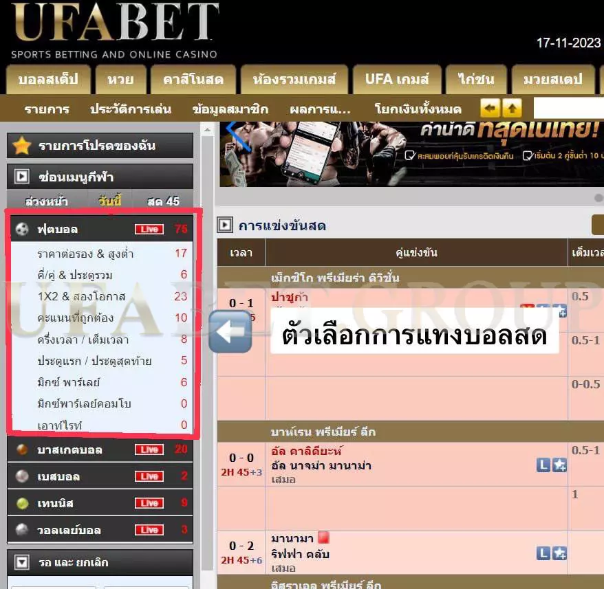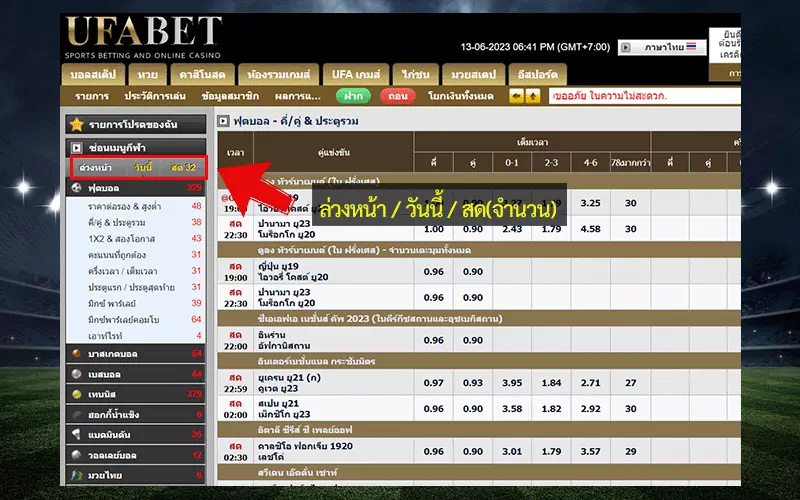 หากต้องการไปที่ส่วน live betting ของบัญชี UFABET เข้าสู่ระบบ กีฬา การพนันออนไลน์ และหน้าแรกของคาสิโน ให้ไปที่เมนูกีฬาด้านซ้ายมือซึ่งคุณจะพบแท็บสามแท็บที่แตกต่างกันด้านล่าง แท็บต่างๆ มีป้ายกำกับว่า “แต่เช้า” “วันนี้” และ “สด” ดำเนินการคลิกบนแท็บ จากนั้นเกมและกระดานราคาของคุณจะแสดงเฉพาะการแข่งขันสดเท่านั้น